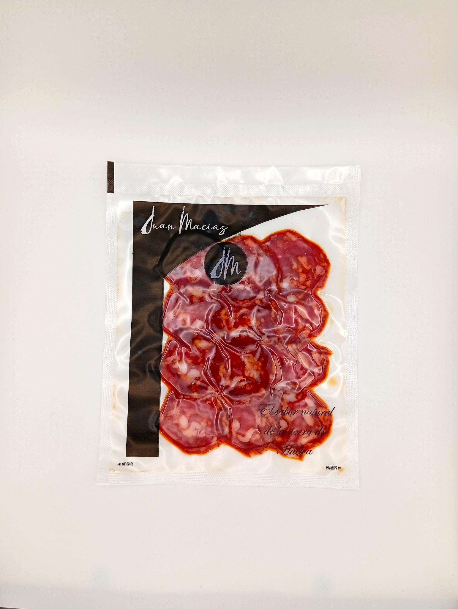 Ingredientes: Carne de cerdo ibérico, sal, pimentón, ajo, dextrina, dextrosa, proteína de cerdo, azúcar, especies, fermentos lácticos, emulgente(E450i y E-450iii), antioxidantes(E-301 y E-330). Potenciador del sabor(E-621), conservadores(E-252 y E-250) y colorante((E-120).