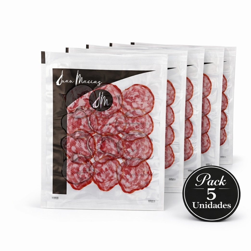 Salchichón ibérico Juan Macías loncheado en sobres de 50g. Pack de 5 unidades, sabor suave y tradicional. Compra online en Hecho en Huelva.
